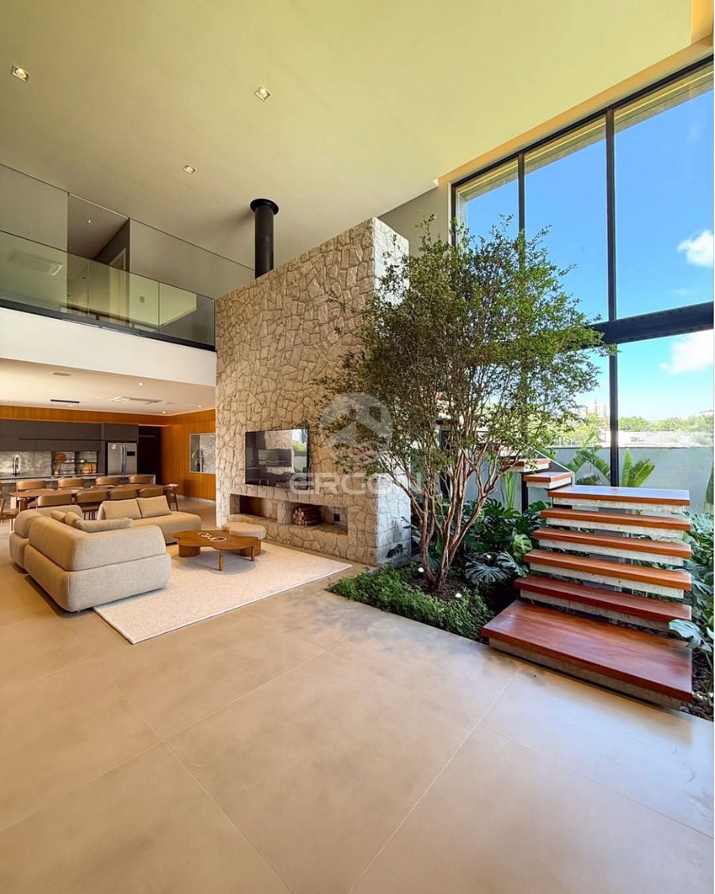 - ⁠Living integrado com lareira e pé direito duplo